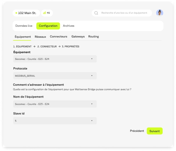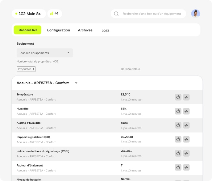 Sur la console Bridge, les utilisateurs peuvent configurer leur équipement à distance et accéder à des données et des logs en temps réel. Les données ne sont pas stockées sur le serveur de Wattsense.